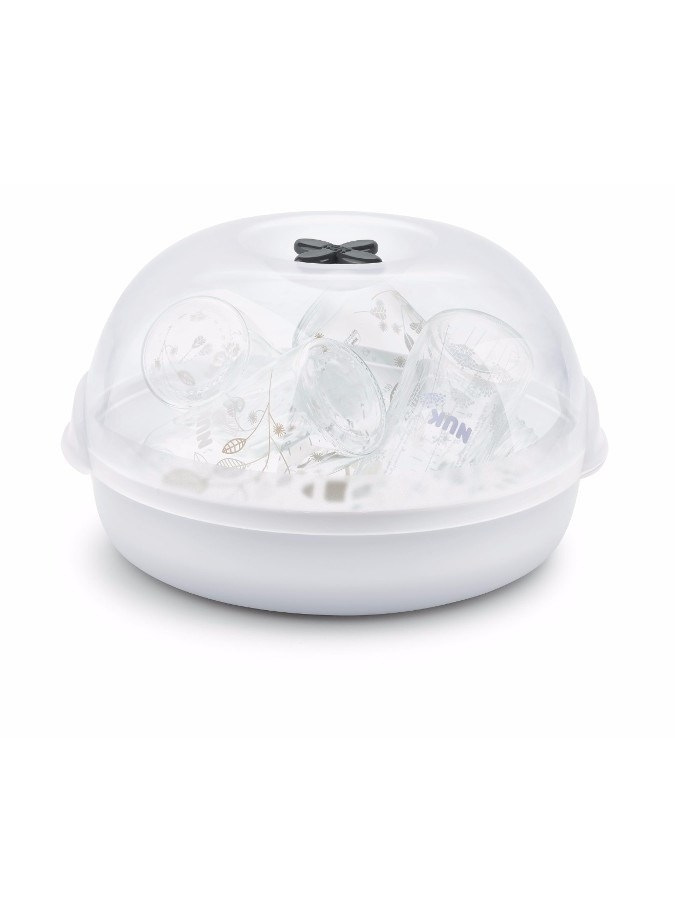 Sterilizátor do mikrovlnnej rúry Vario Express Plus Nuk. Parný sterilizátor do mikrovlnnej rúry Micro Express Plus NUK až pre štyri fľaše a príslušenstvo, rýchly, účinný a dôkladný. Je ideálny pre každodennú sterilizáciu dojčenských fliaš (okrem PA fliaš) a príslušenstvo, ktoré sú vhodné do mikrovlnnej rúry. Sterilizuje až štyri fľaše a príslušenstvo len za štyri minúty (nastavenie výkonu na 1 000 wattov) s jednoduchou obsluhou. Súčasťou balenia sú kliešte na fľaše pre hygienické vybratie. Pozor na minimálnu potrebnú veľkosť mikrovlnnej rúry. Rozmery: výška cca 18-19 cm, šírka cca 30 cm, hĺbka cca 29-30, obvod cca 83 cm.