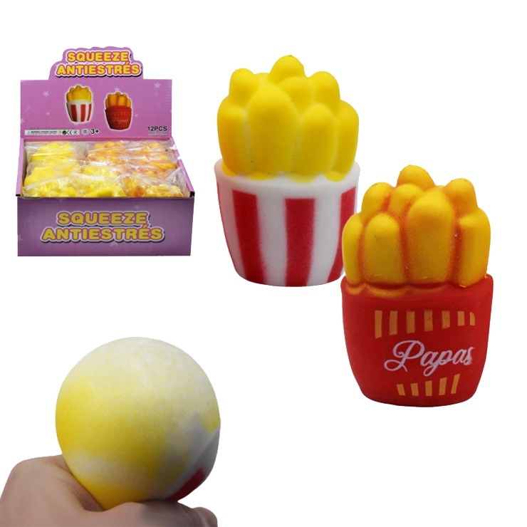 Antistresové 9cm stláčacie hranolky. Možnosť výberu z dvoch druhov - pásikavý alebo červený kelímok. Nevhodné pre deti do 3 rokov.
