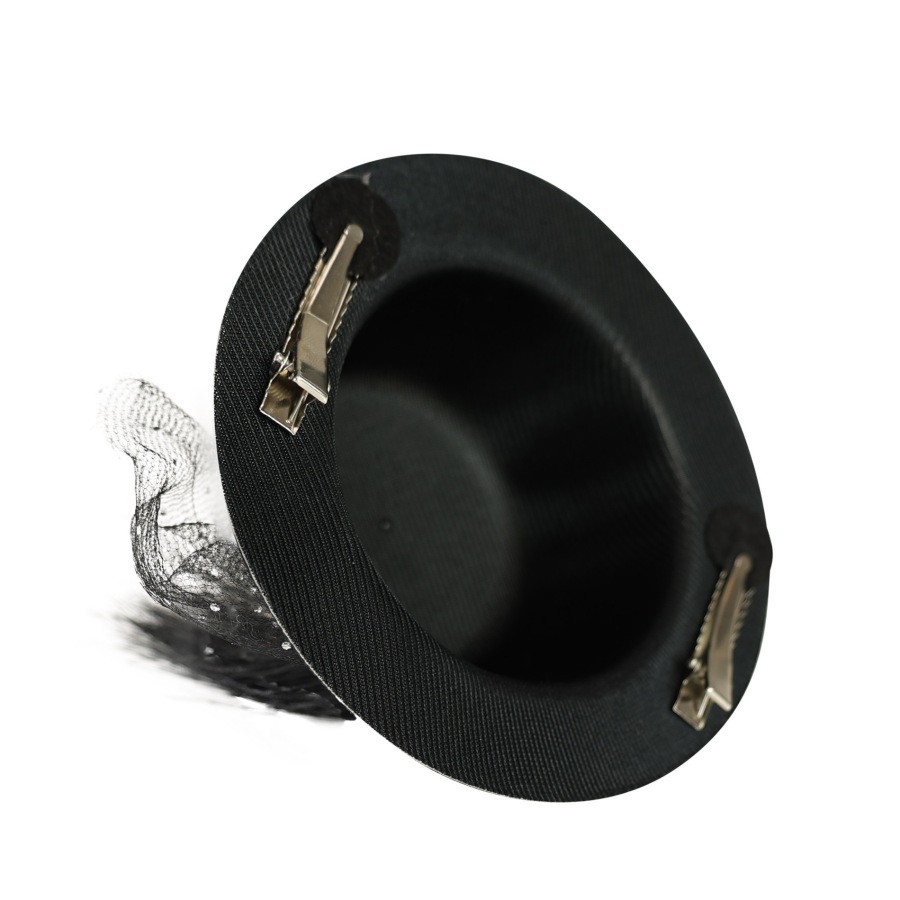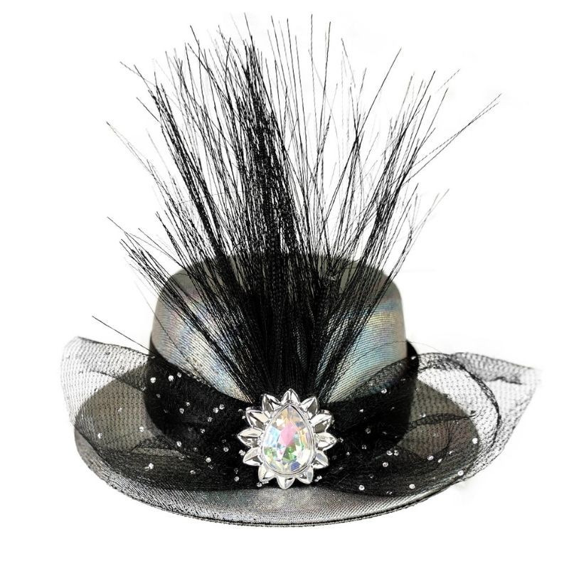 Mini klobúčik striebornej farby s čiernou stuhou, perím a tylom je doplnený šperkom. Pripevniť klobúčik k vlasom je možné pomocou dvoch sponiek. Je výrazným doplnkom ku karnevalovým a párty kostýmom.