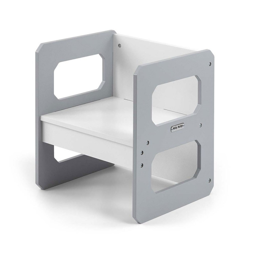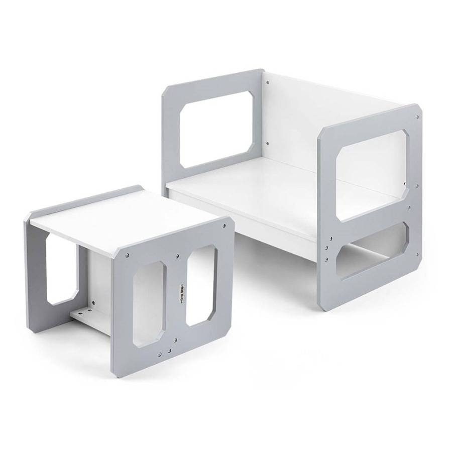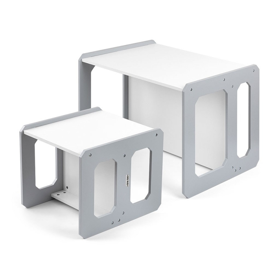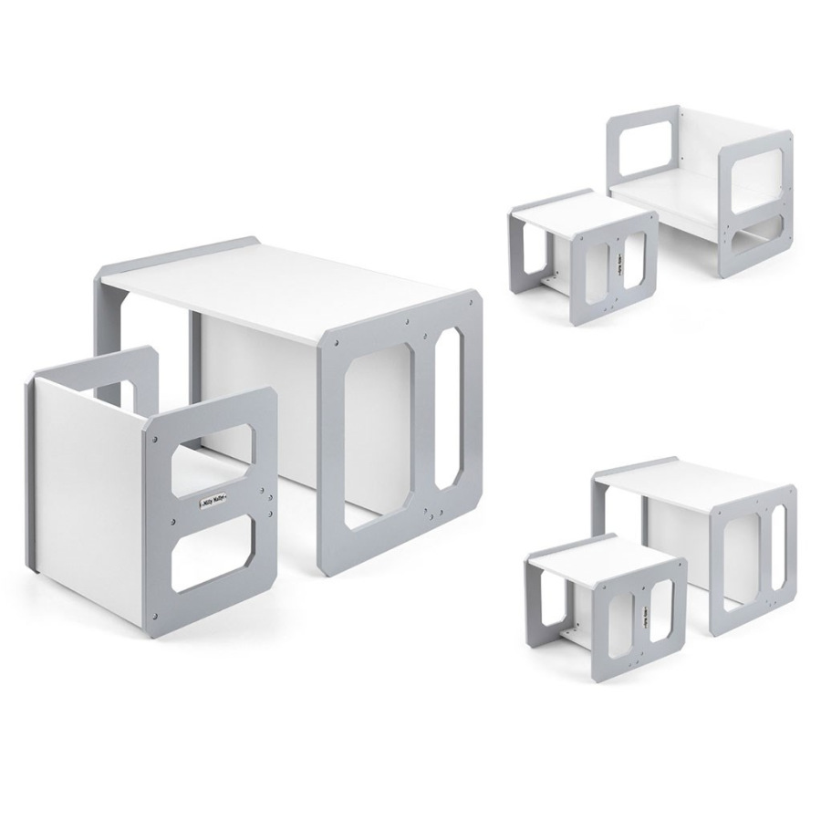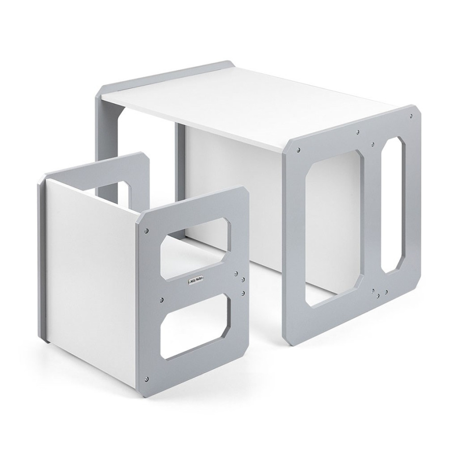 Sada sa skladá z jedného stolíka a jednej stoličky, ktoré vďaka modulárnej konštrukcii môžu plniť rôzne funkcie – stolík je možné premeniť na väčšie sedadlo a stolička sa výborne hodí ako menší stolík alebo sedadlo bez operadla pre staršie dieťa. Vďaka svojej ľahkej konštrukcii je tento nábytok ľahko prenosný, čo umožňuje deťom prispôsobiť si ho podľa svojich potrieb.