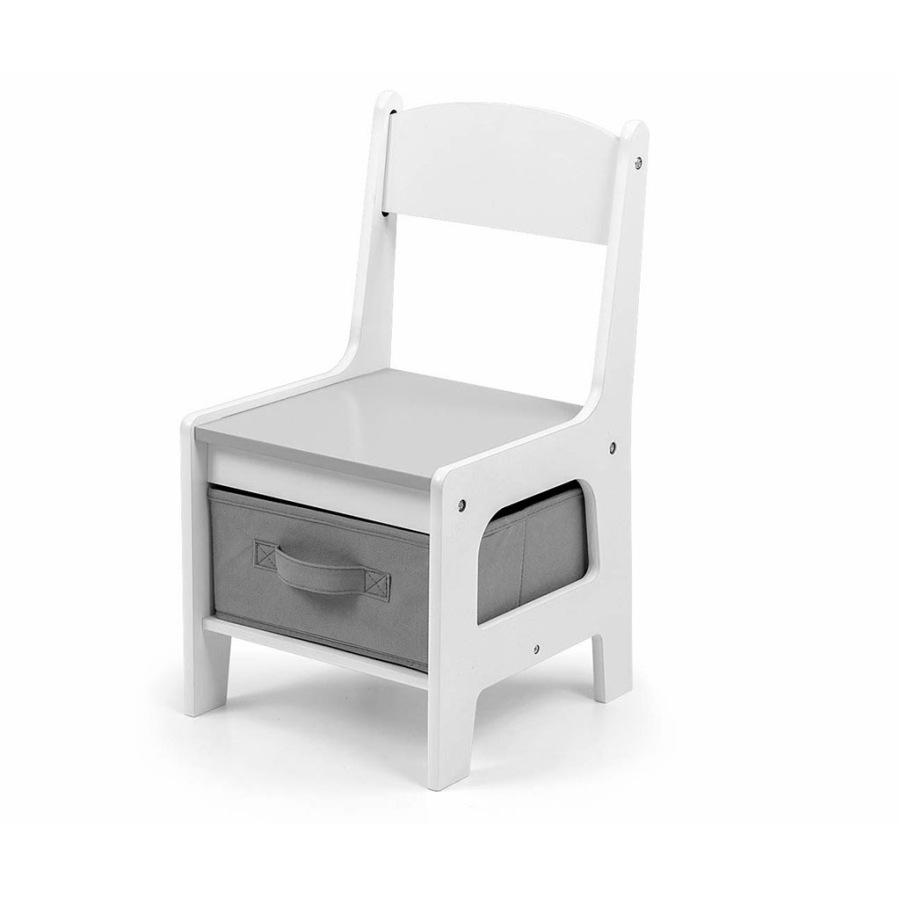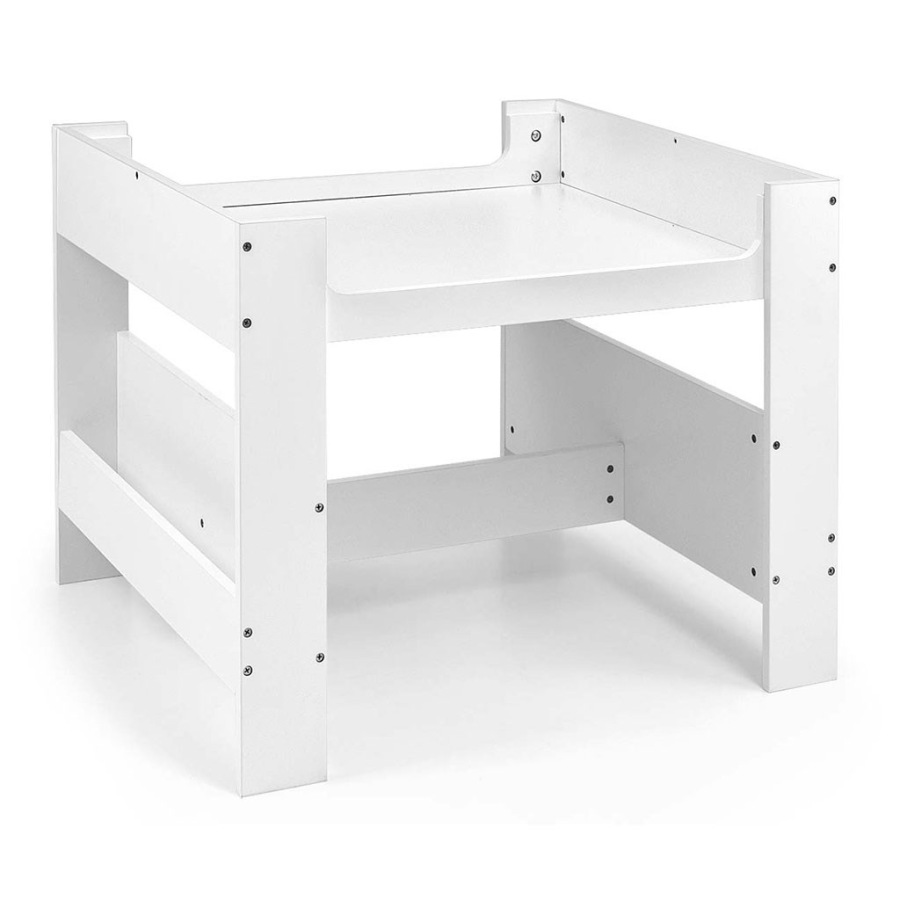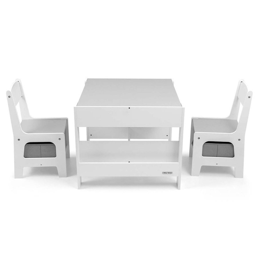 Súprava multifunkčného nábytku pre deti. Stôl SVEN s 2 stoličkami v bielej a sivej farbe so sivými doplnkami je vyrobený tak, aby deťom poskytoval: pohodlie, priestor na tvorivú hru, maľovanie, písanie a maximálne pohodlie počas aktivít. Súprava obsahuje 2 stoličky s 2 textilnými úložnými pomôckami zasunutými do poličky pod stoličkami. Stôl je vybavený obrovským úložným priestorom umiestneným pod obojstrannou odnímateľnou doskou. Má aj bočné úložné poličky. Na jednej strane stolovej dosky sa nachádza veľká kresliaca doska. Stoličky sú ľahké a deti s nimi môžu voľne pohybovať. Nábytok je vyrobený s výnimočnou precíznosťou a starostlivosťou. Obe stoličky majú zaoblené rohy, ktoré chránia dieťa pred zranením. Všetky prvky konštrukcie stola a stoličiek zabezpečujú vysokú stabilitu a minimalizujú riziko pádu. Súprava Sven je vyrobená z MDF je odolná a ľahko sa udržiava. Súprava nábytku sa ľahko zostavuje a všetky komponenty potrebné na montáž sú súčasťou balenia.