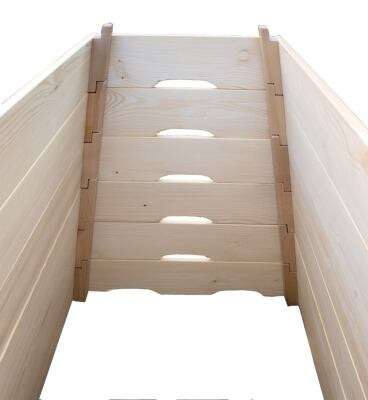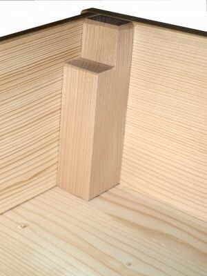 Výrobok sa skladá z siedmich dielov, vrchný diel je čalúnený modrou koženkou. Celková výška debny je 110 cm, ktorá sa dá odoberaním dielov postupne znižovať. Jednotlivé diely sú vyrobené zo smrekového masívneho dreva, ktoré sú v rohoch pomocví skrutiek a lepidla pripevnené k bukovým (pre vyššiu odolnosť) kotevným špalíkům. Pre pohodlné zostavovaní a prenášanie sú jednotlivé diely opatrené otvormi pre ruky, ktoré sú v čelách dielov. Povrchová úprava: 3x lakované transparentným vodou riediteľným lakom od rakúskej spoločnosti Adler. Používaný lak AQUA-MIRA. Rozmery: výška debny 110 cm, šírka dole 85 cm, šírka hore 50 cm, dĺžka 125 cm. Hmotnosť: 56 kg.Upozornenie: Vzhľadom k rozmerom produktu sa doprava rieši individuálne po dohovore s našim predajcom.