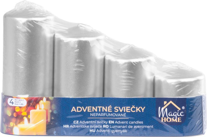 Adventné sviečky MagicHome skvele dotvoria čarovnú atmosféru Vianoc u Vás doma. Perfektne sa hodia na dotvorenie do advetných vencov či dekorácií. 4 rôzne výšky - 4,8x6 cm - váha vosku 85g, 4,8x8 cm - váha vosku 110 g, 4,8x10 cm - váha vosku 140 g, 4,8x12 cm - váha vosku 170 g. Farba: strieborná.