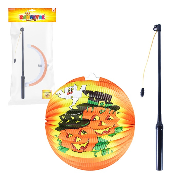 Papierový lampión s motívom tekvice ak nemu svietiaci prútik. Ideálna sada na Halloween párty alebo lampiónový sprievod!
