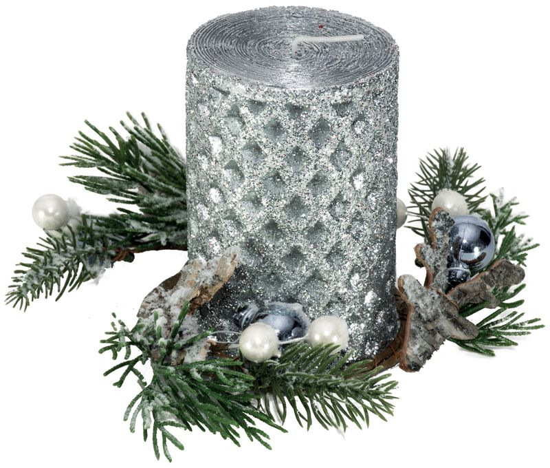 Svietnik MagicHome Vianoce, 15x15x10 cm, strieborná valcová sviečka, dekorácia s vetvičkami