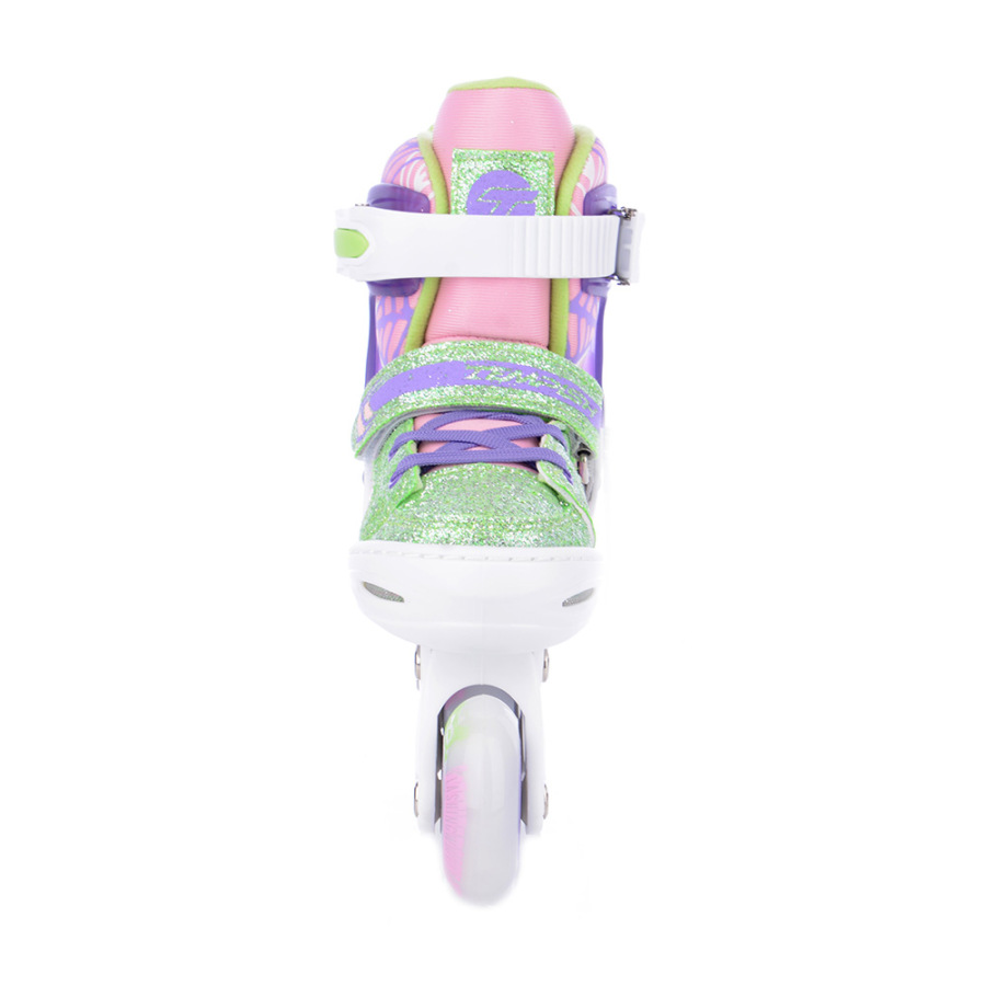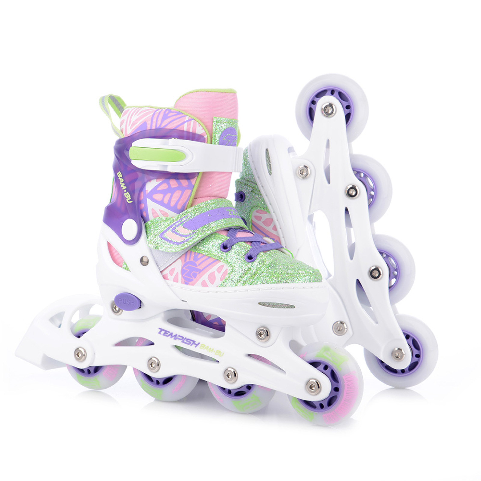TEMPISH BAM-BU FLASH GIRL sú najmenšie detské kolieskové korčule z ponuky TEMPISH, ideálne pre prvé jazdy aj pokročilejších detských korčuliarov. Vďaka šikovnému nastaviteľnému skeletu začínajú už na veľkosti EU 26 a môžu rásť spolu s dieťaťom - nastavenie zvládnete ľahko a rýchlo pomocou systému EASY PUSH (stlačenie poistky a posunutie špičky).