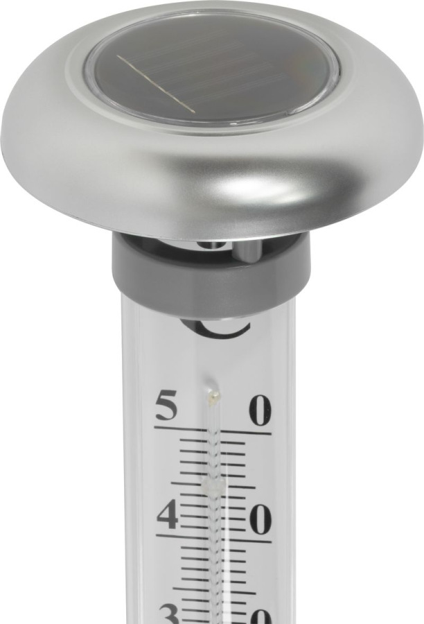 Veľký solárny záhradný teplomer s pevným hrotom na zapichnutie do zeme s LED osvetlením. Pôsobivý a ľahko viditeľný v noci. Rozmery: 62x9 cm.