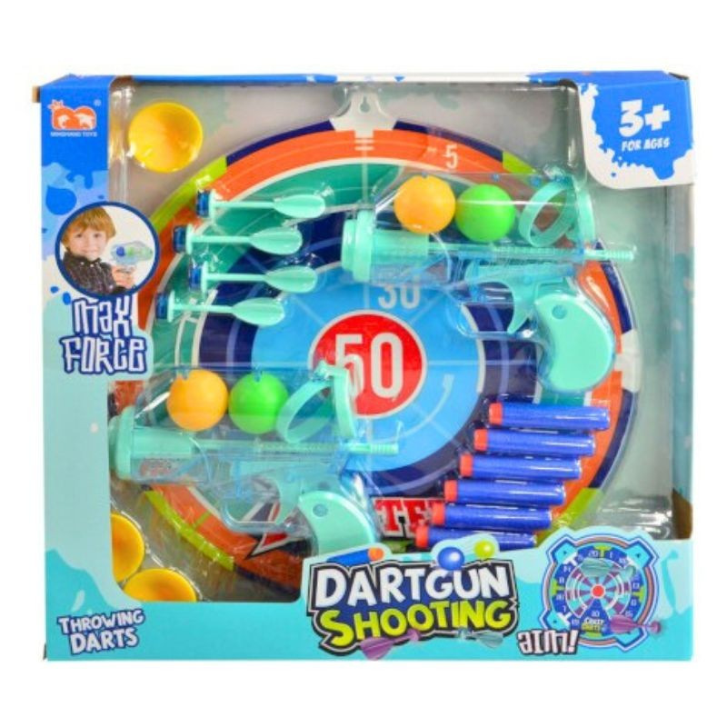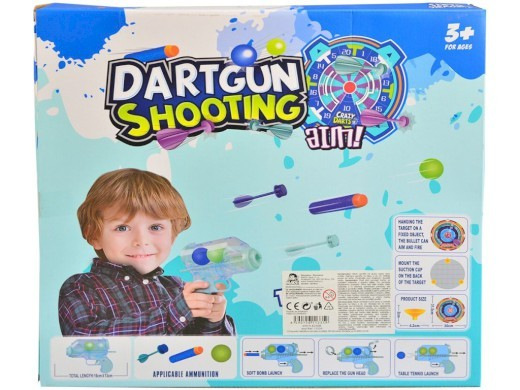 Sada s terčom a príslušenstvom prinesie deťom zábavnú hru na presnosť a streľbu. Balenie obsahuje dve pištole a rôzne druhy nábojov, ako sú loptičky, penové strely a šípky bez ostrých hrotov, ktoré sú navrhnuté s ohľadom na bezpečnosť detí. Terč s priemerom približne 25 cm je možné jednoducho pripevniť pomocou priložených prísaviek a vytvoriť si tak vlastnú streleckú hru doma aj vonku.