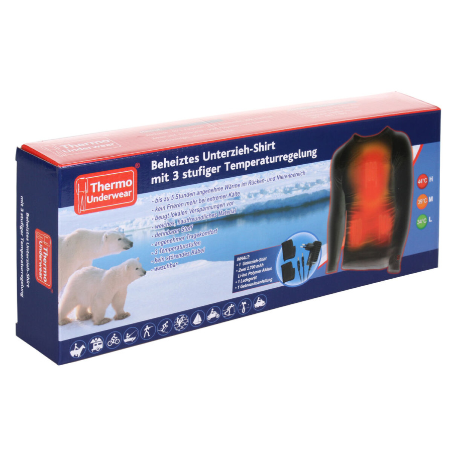 Zatiaľ najnovší počin úspešnej rakúskej firmy designed4inspiration produkujúce vyhrievané doplnky sú elektricky vyhrievané tričko Thermo Undershirt a elektricky vyhrievané nohavice Thermo Underpants. Thermo Undershirt je funkčné tričko s dlhým rukávom vybavené v oblasti chrbta flexibilnými vykurovacími telieskami z uhlíkových vlákien, ktorého spoločne s 2 vysoko výkonnými lítium-polymér batériami dokážu zahrievať Váš trup, podľa nastavenej teploty a teploty okolia, až 5 hodín. Ani potom však nemusíte trpieť zimou. Stačí vymeniť vybité batérie umiestnené zvisle na ľavom boku za batérie náhradné, ktoré môžete mať vďaka zanedbateľnej veľkosti a ešte menšej hmotnosti treba vo vrecku nohavíc. Výmena je rýchla a jednoduchá. Vyhrievané tričko s dlhým rukávom Thermo Undershirt tiež umožňuje mechanickú reguláciu teploty v troch stupňoch (34°C, 39°C alebo 44°C) pomocou jediného tlačidla s farebnou signalizáciou na spodnom leme ľavého rukáva. Okrem tričká s elektrickým vyhrievaním a 2 batérií je súčasťou balenia aj adaptér 220V a nemôže chýbať ani český návod. Materiál trička: 65% polyester, 25% bavlna, 10% elastan na chrbte + 90% polyester, 10% elastan predný diel a rukávy.Údržba: nepoužívajte v práčke, iba pre ručné umývanie. XS-SM-LXL-XXLMUŽI44-4648-5254-58ŽENY36-4042-4446-48