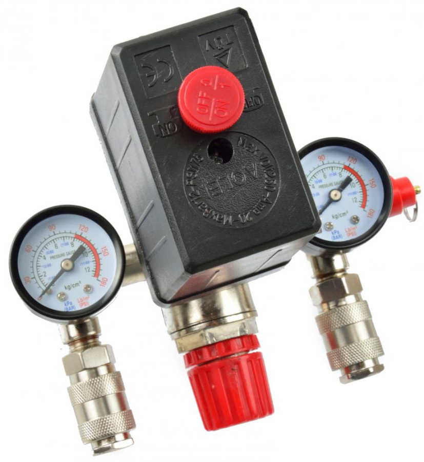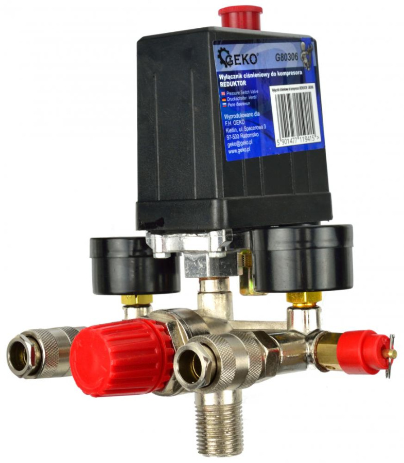 Tlakový spínač na kompresor 8 bar, 230V, 2 výstupy 1/4" s manometrami, GEKO