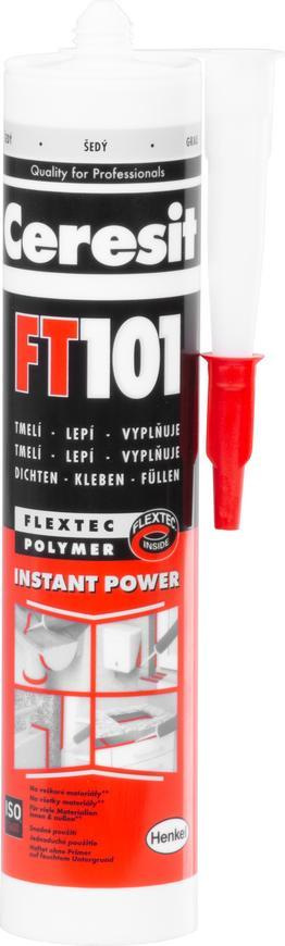 Univerzálny tesniaci a lepiaci tmel. Lepí, tmelí, vypĺňa. Ceresit FT 101 je viacúčelový, jednozložkový, elastický lepiaci tmel určený na použitie v interiéri aj exteriéri, založený na technológii Flextec®, ktorý vytvrdzuje reakciou so vzdušnou vlhkosťou. FT 101 sa odporúča na elastické spoje a utesňovanie, montáž okenných parapetov, podlahových líšt, dlaždíc, spájanie kovových prvkov, utesňovanie rozvodov, ventilácie a klimatizácie, vyplňovanie dilatačných škár v podlahách a stenách (vertikálne aj horizontálne spoje), vyplňovanie prasklín a pod. Je vysoko mechanicky odolný. FT 101 sa nanáša štandardnou výtlačnou pištoľou. Farba: šedá.