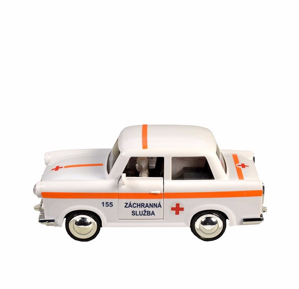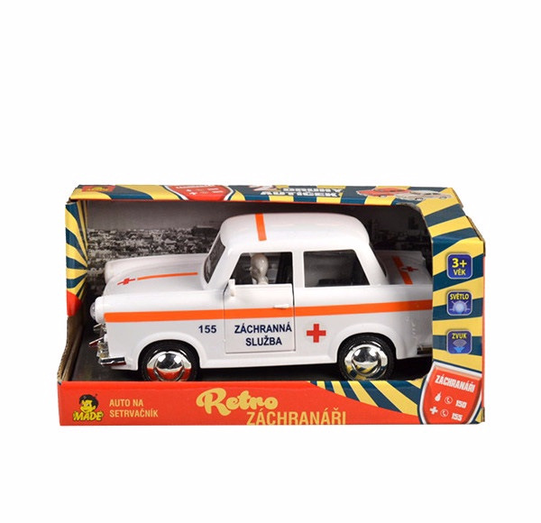 Trabant Záchranársky je 18 cm veľký s pohonom na zotrvačník s otváracími dverami.Po vytiahnutí poistky a stisnutí sa zasvietia predné svetlá so zvukom štartu a chodu motora.
