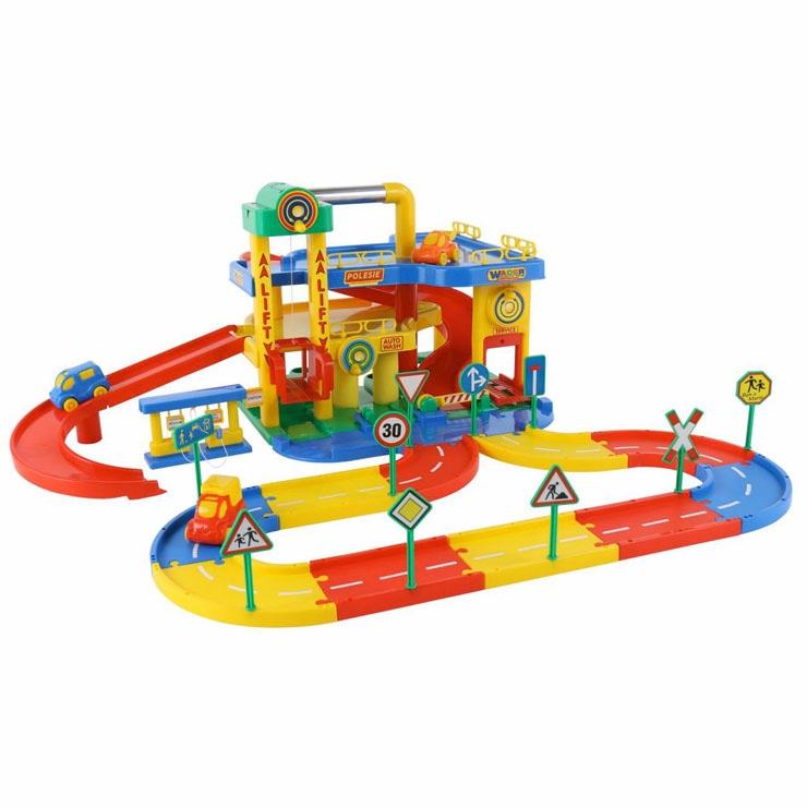 Veľká garáž s dráhou a množstvom funkcií - umývačka s rotujúcimi valcami, benzínová pumpa, servisná stanica so zdvíhacou plošinou a ani výťah nesmie v správnej garáži chýbať. Garáž je možné zložiť a odniesť alebo vziať so sebou na cesty. Súčasťou garáže sú 4 autíčka. Garáž s dráhou ma po zložení dĺžku 100, šírku 90 a výšku 38 cm. Výrobok je od značky Wader quality toys.
