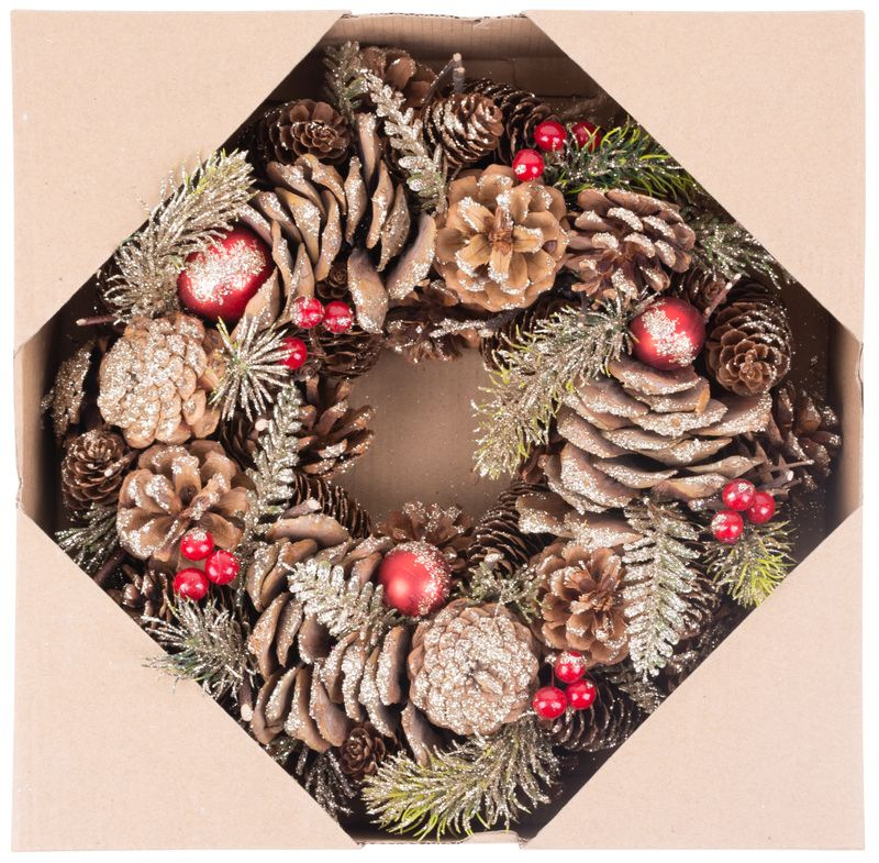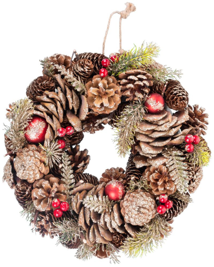Závesný veniec MagicHome by nemal chýbať vo výbave vášho interiéru počas vianočných sviatkov. Je to vkusný veniec so šiškami a čečinou. Jeho rozmer je 30x8 cm.