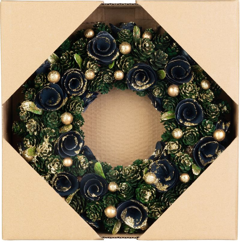 Dizajnový vianočný veniec MagicHome prinesie do vášho domova nádych elegancie a sviatočnej atmosféry. Veniec je zdobený prírodnými šiškami, dekoratívnymi kvetmi a ozdobnými guľôčkami v zeleno-modro-zlatých tónoch, ktoré vytvárajú moderný a pritom teplý vzhľad.