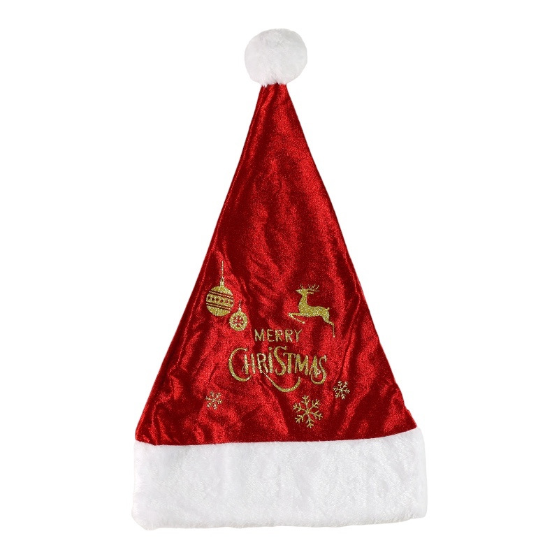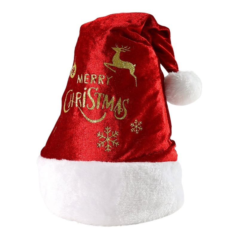 Štýlová červená čiapka so zlatou vianočnou potlačou a bielym brmbolcom je deálny doplnok ku kostýmu alebo len tak na vianočný večierok!