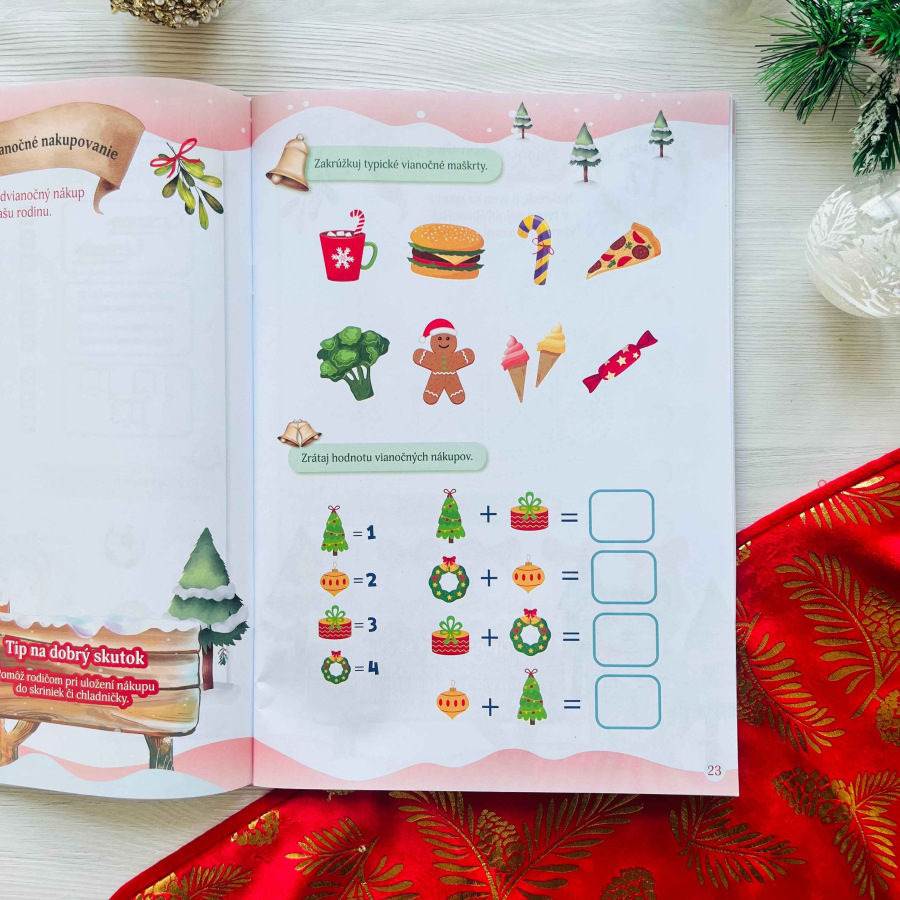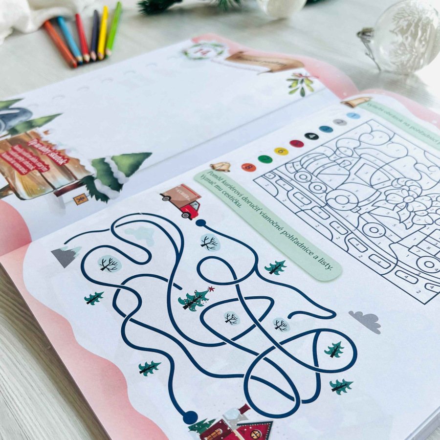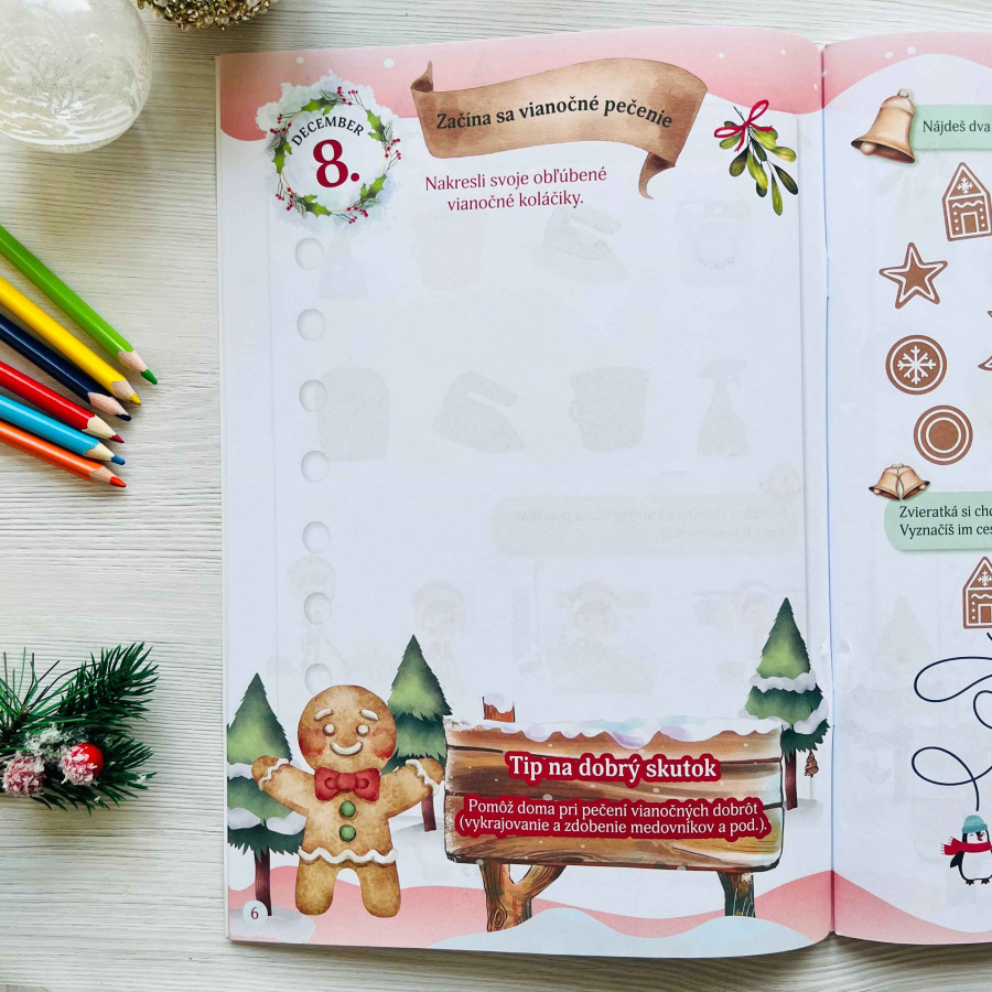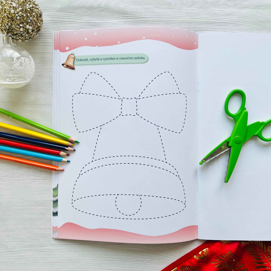 Vianočný denník obsahuje 56 strán kreatívnych úloh s vianočnou tematikou, ktoré deťom spríjemnia čakanie na najkrajšie sviatky. Od 6. do 31. decembra každý deň čaká jedna dvojstránka s úlohami na kreslenie, maľovanie, spájanie či počítanie, ktoré rozvíjajú jemnú motoriku, logiku a predstavivosť. Prílohy ako vianočné pexeso, vystrihovačky, predloha listu pre Ježiška a menovky na darčeky robia z denníka darček ideálny.