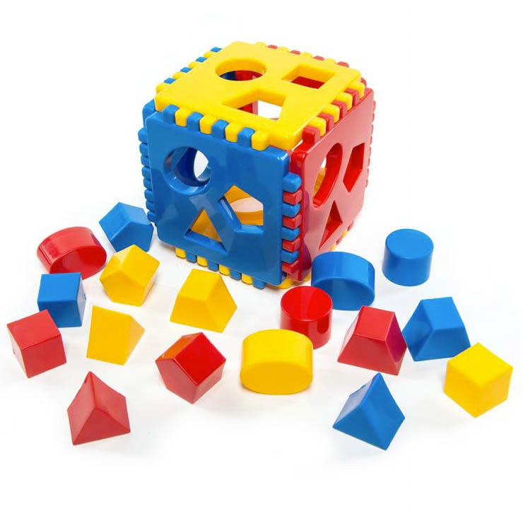 Trojfarebná plastová kocka má oddeliteľné steny a deti si ju môžu skladať a rozkladať. Pokiaľ je kocka zložená, vkladajú si deti jednotlivé tvary do príslušných otvorov. Na tejto didaktickej hračke si deti trénujú jemnú motoriku a trpezlivosť. Rozmery kocky sú 13 x 13 x 13 cm. Vhodné pre deti od 6 mesiacov.