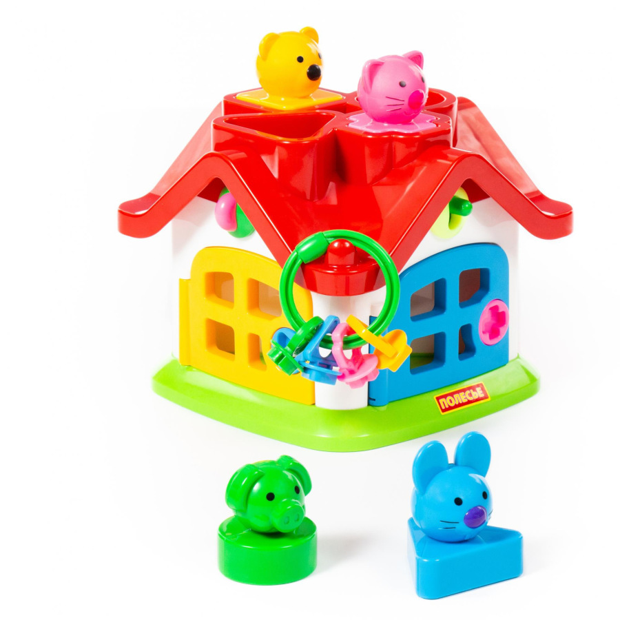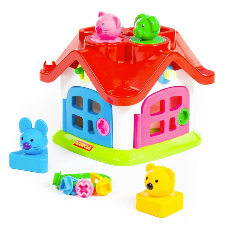 Didaktický domček s mechanickým otváraním dvierok, možnosť zamykania 4 dvierok kľúčikmi s rôznymi tvarmi, vkladacie zvieratká v rôznych tvaroch.