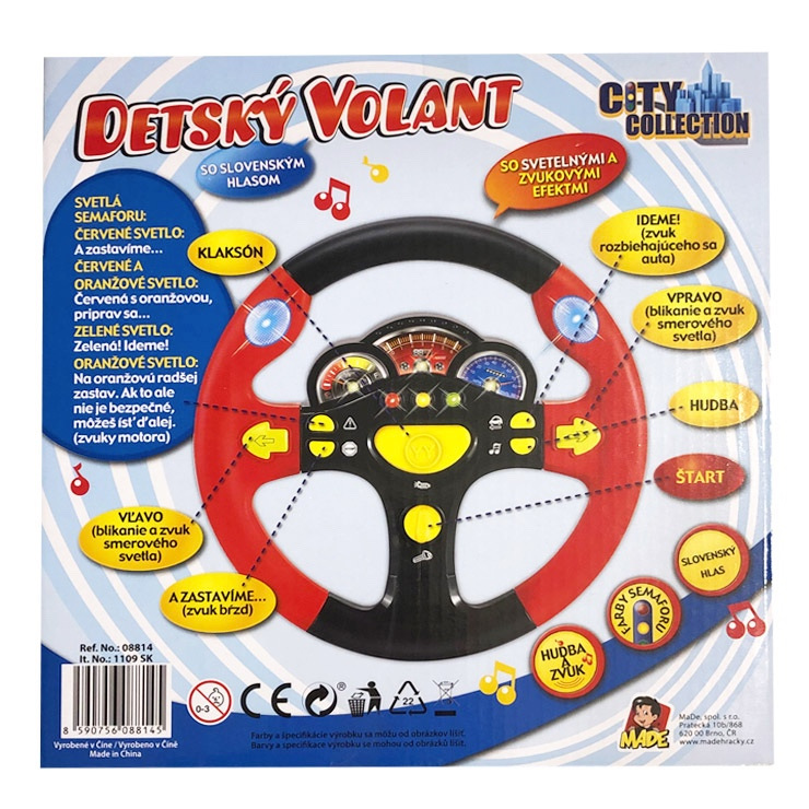 Detský volant so slovenským hlasom a svetelnými efektmi. Dieťa sa pri hre učí farby semaforu, ľavú a pravú stranu alebo sa môže hrať na vodiča. Po náročnej jazde si môže chvíľu spríjemniť veselú melódiu.