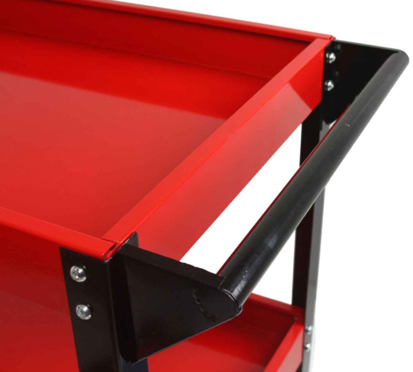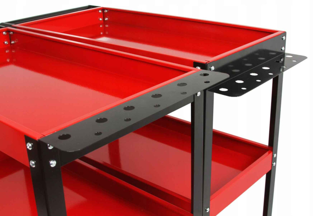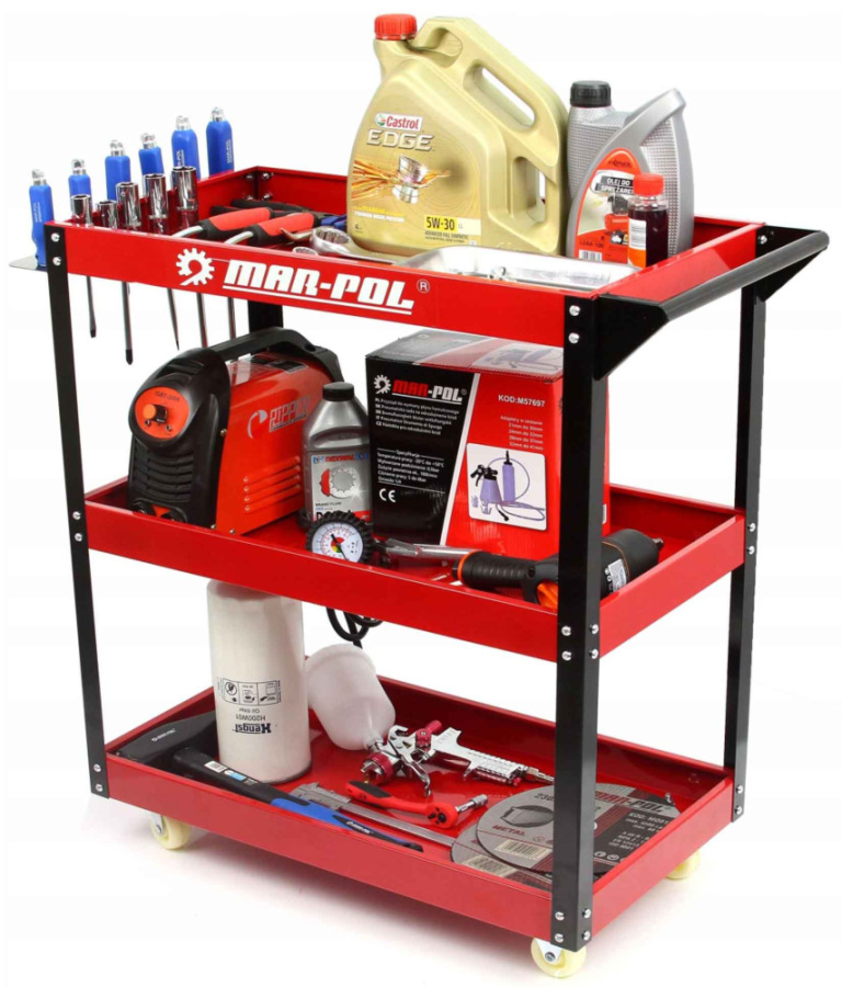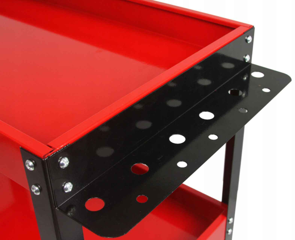 Oceľový vozík s tromi policami. Je ideálny pre dielne a služby a je tiež dobrým riešením pre domácich majstrov. Uľahčuje to prácu, pretože každý nástroj máte vždy po ruke. Je vybavená štyrmi kolesami, dvoma pevnými a dvoma otočnými, a kovovou rukoväťou, ktorá uľahčuje premiestňovanie. Vozík je možné použiť aj na prepravu malých balíkov.