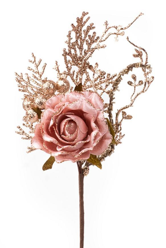 X Vetvička MagicHome Vianoce, s ružou, ružovo - zlatá, 26cm, bal. 6 ks