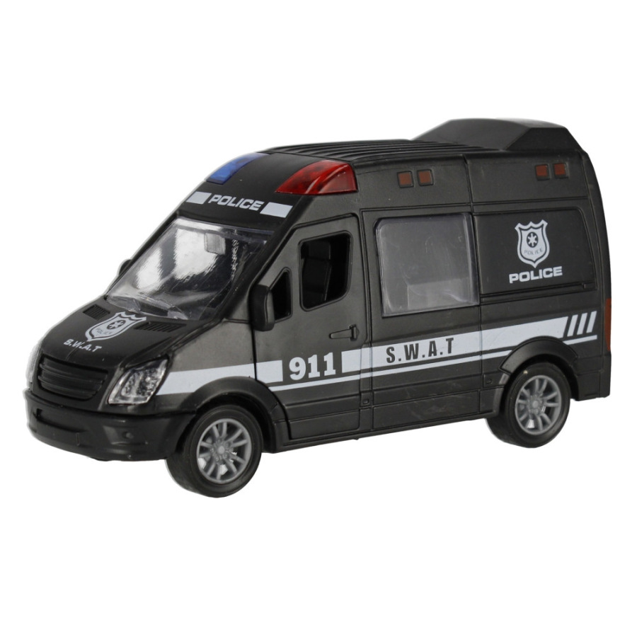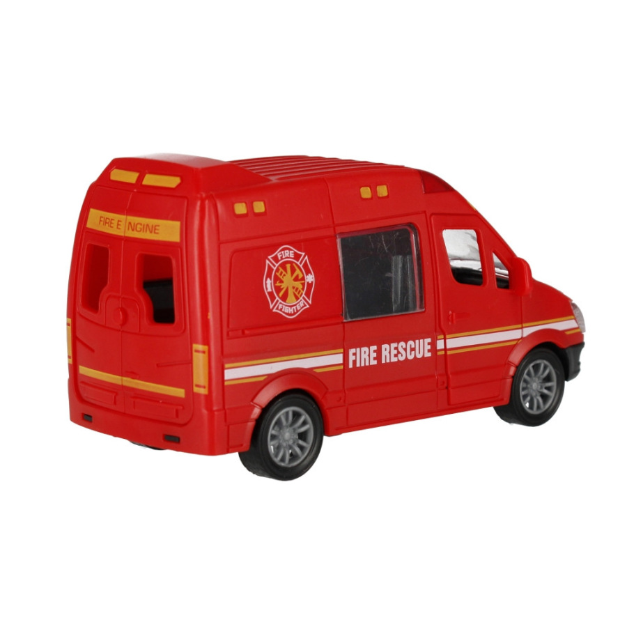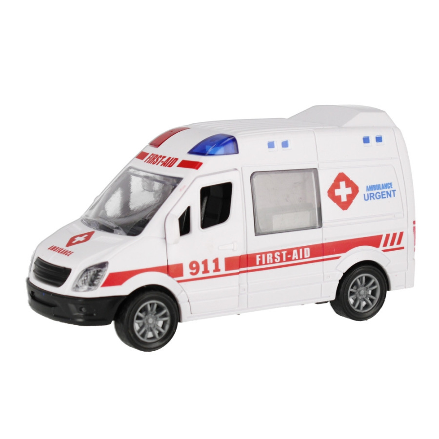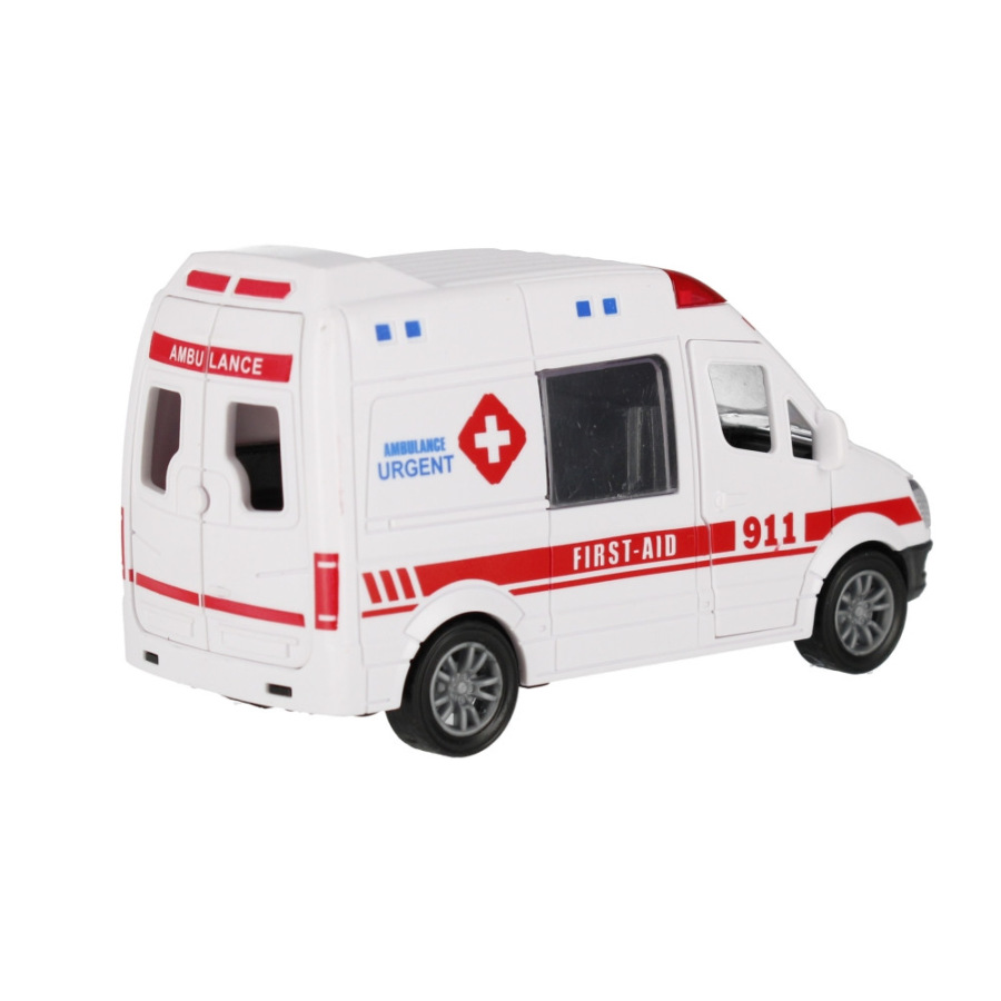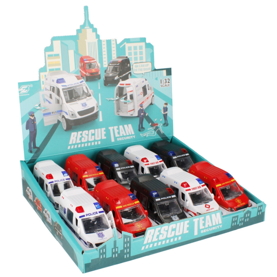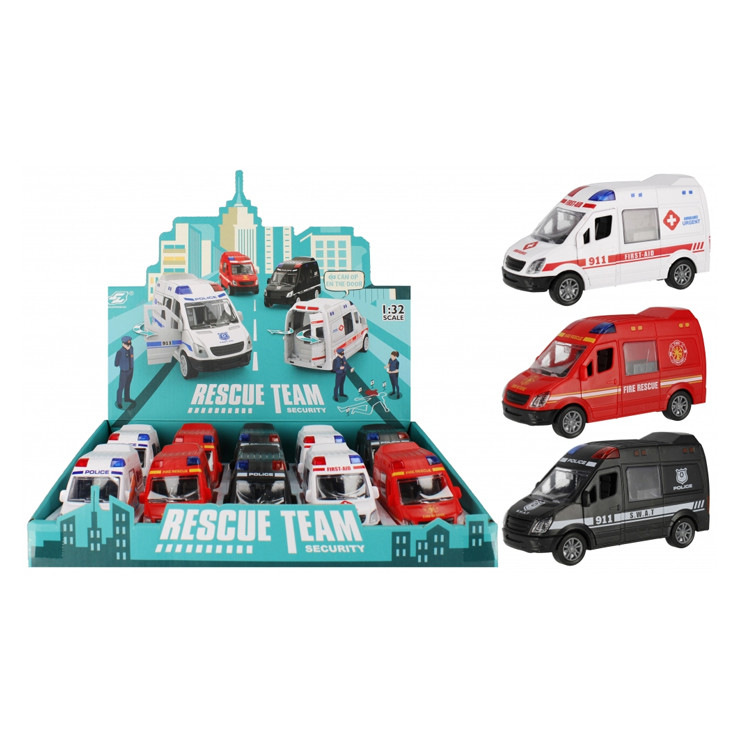 Záchranné autá, sú dostupné v troch vzoroch a farbách červená(hasičské),čierna(policajné),biela(záchranárske). Rozmery produktu sú 12x6x5cm. Hračka balená v balení po 10 ks. Cena je za 1 kus. Hračka je určená pre deti vo veku 3+.