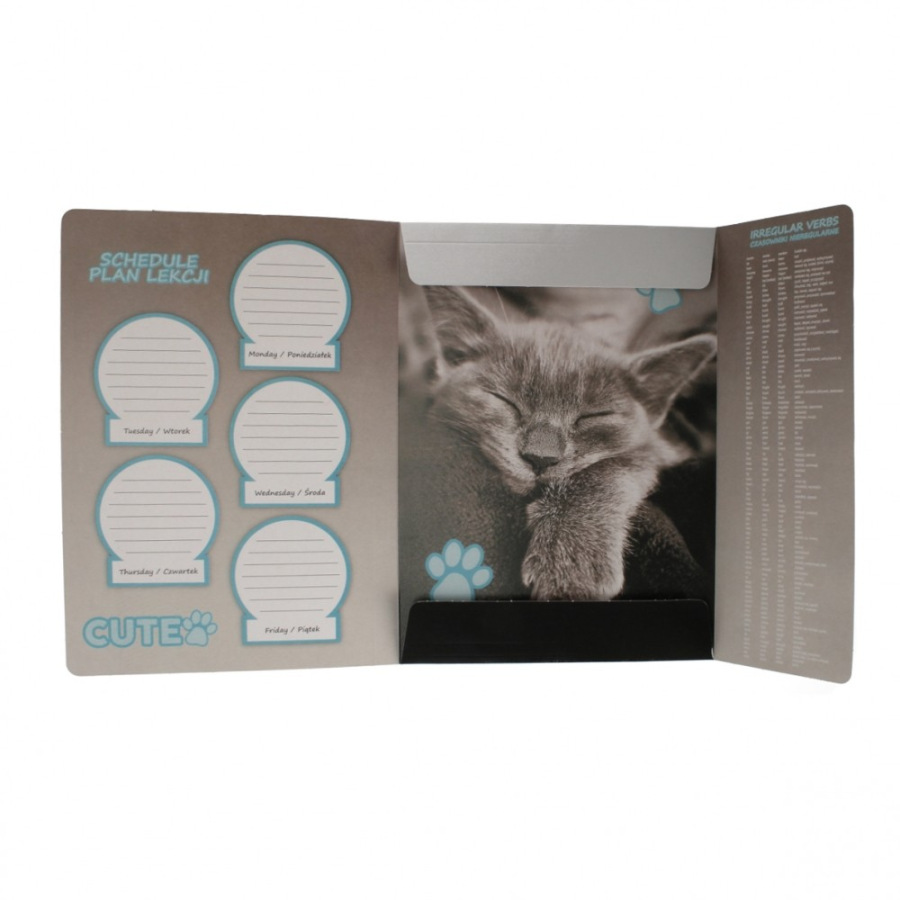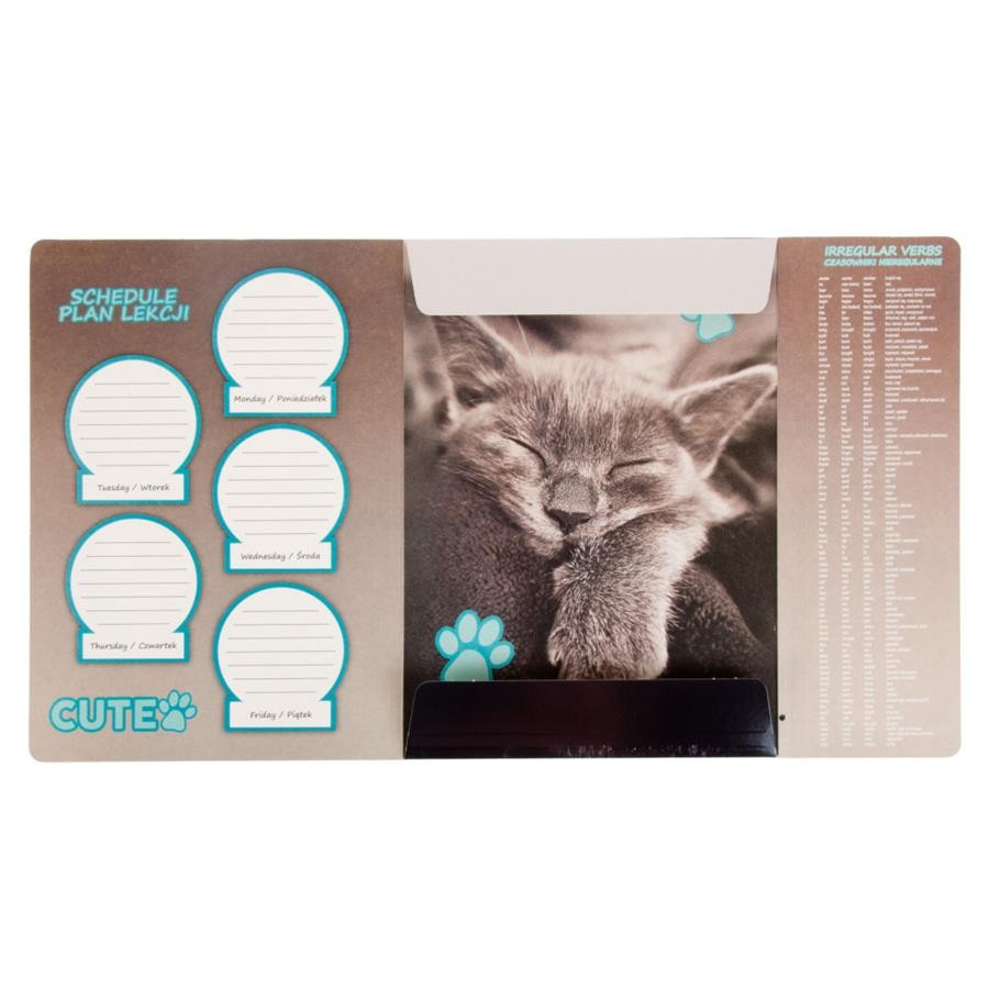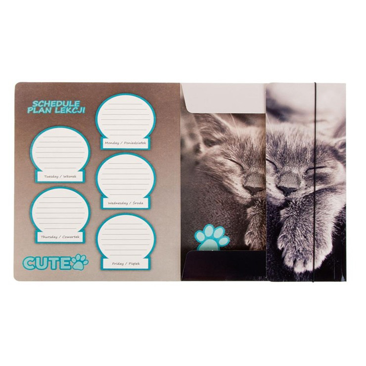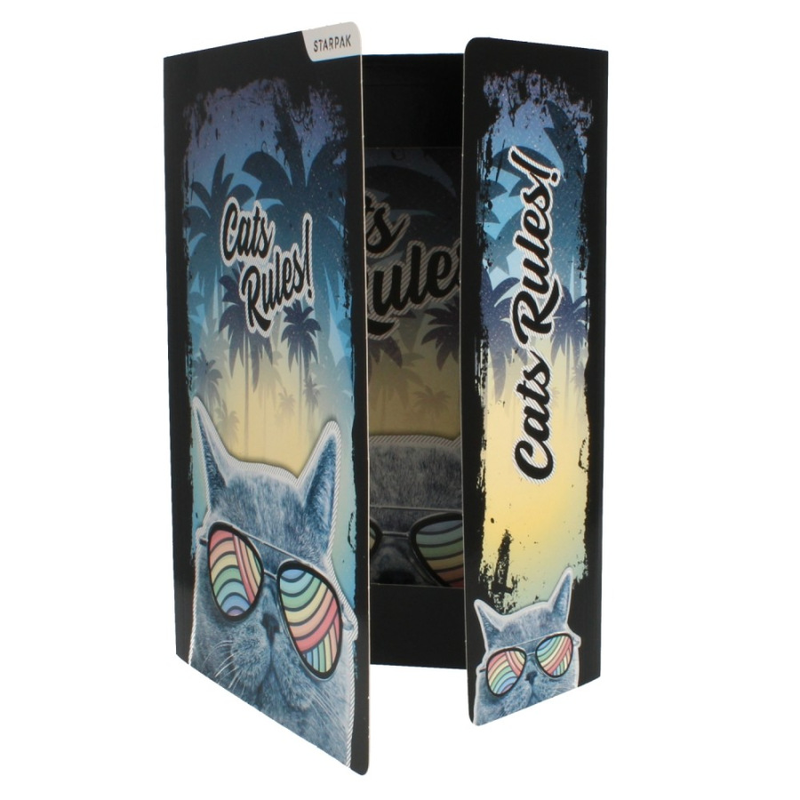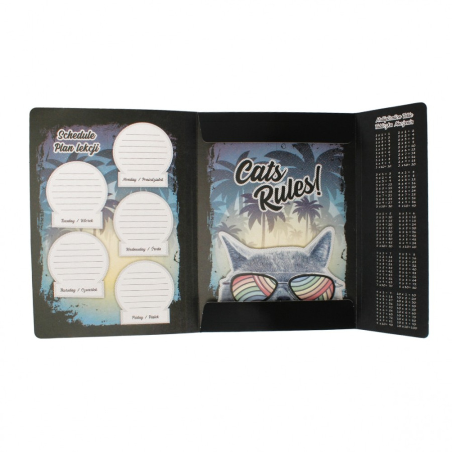 Zakladač s gumičkou na uloženie dokumentov s grafikou s mačkami. Produkt je určený pre deti vo veku 3+. Rozmer je A4.