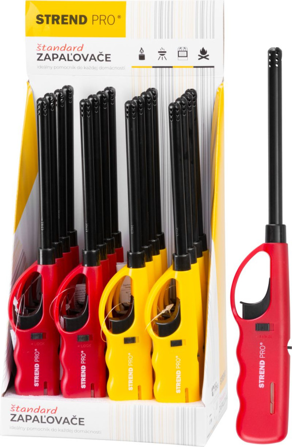Zapaľovač Strend Pro je vhodný na akékoľvek použitie pri zapaľovaní. S detskou poistkou. Opätovne plniteľný. Druh plynu: propán-butánová zmes. Rozmer: 28 cm. Sellbox obsahuje 16 ks zapaľovačov červenej a žltej farby.