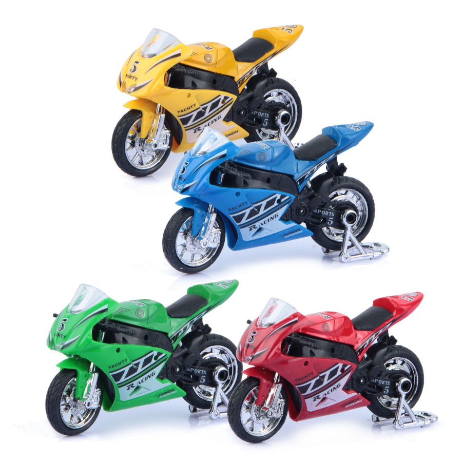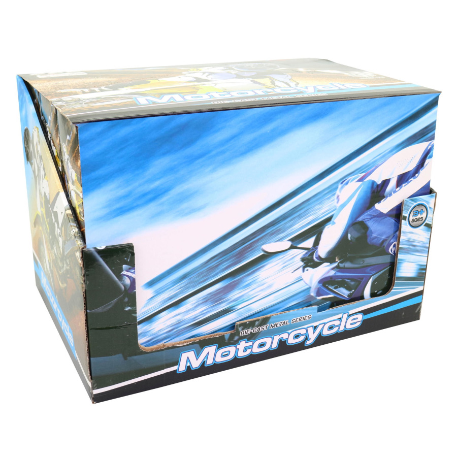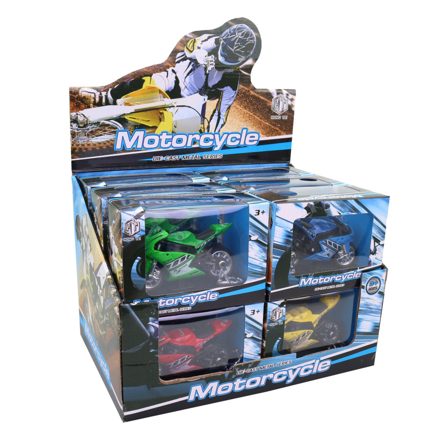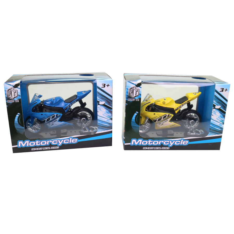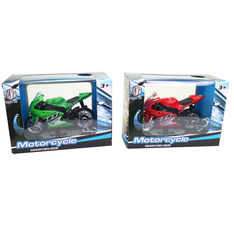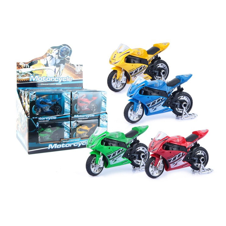 Pretekársky motocykel na voľnobeh, so stojanom. V štyroch farebných variantoch, pre všetkých malých pretekárov a motorkárov. Rozmery balenia sú 15x10x7cm. Farebné varianty sú žltá, modrá, zelená, červená. Určené pre deti vo veku 3+.