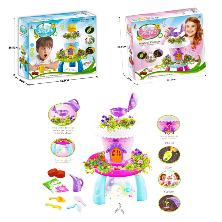 Živá záhradka môže byť aj u teba doma. Sada obsahuje domček s príslušenstvom slúžiaci ako magický kvetináč, zem, semienka kvetov, záhradné náradie s krhličkou a ilustrovaný návod. Hrá aj svieti. Obsahuje batérie. Možnosť výberu modrého alebo ružového kvetináča. Nevhodné pre deti do 3 rokov.