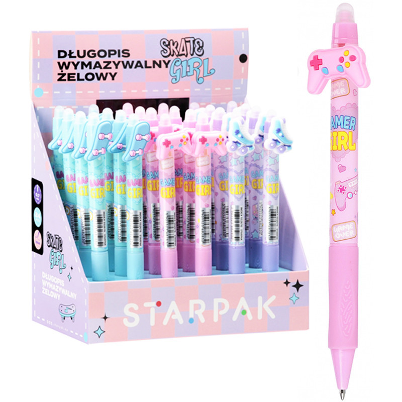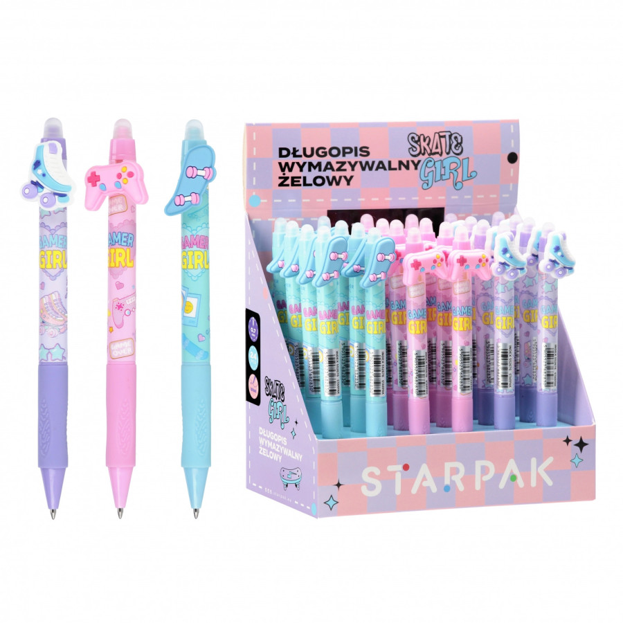 Zmazateľné pero Skate girl, na výber z viacerých variánt. Stopa písania je široká 0,7 mm. Balené v boxe po 24 kusov. Cena je za 1 ks. Vhodné pre deti vo veku 3+ rokov.
