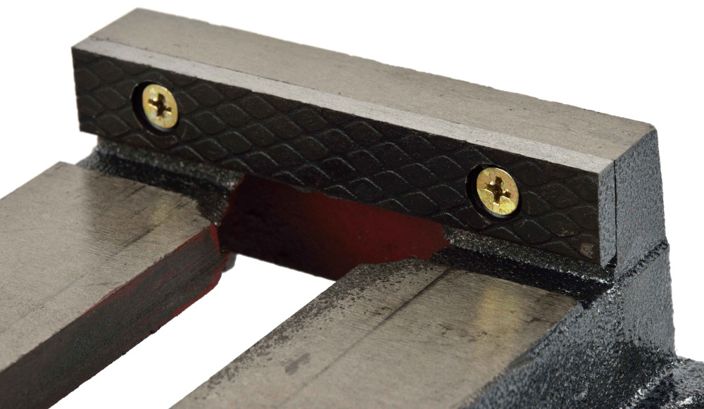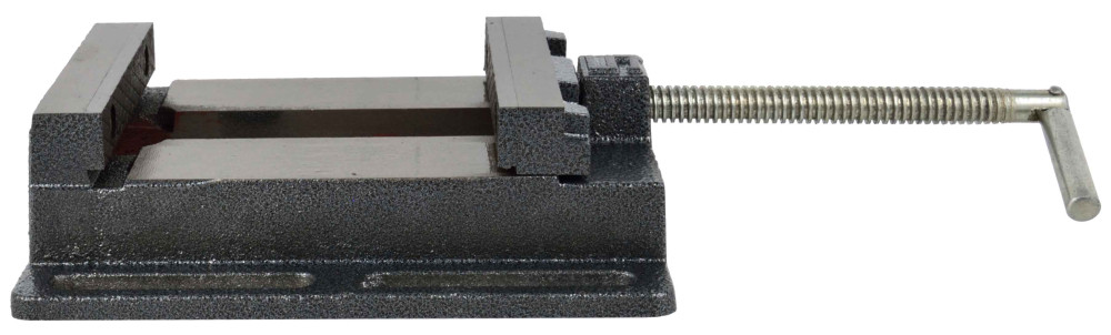 Strojný zverák s drážkovanou základňou pre jednoduchú montáž a umiestnenie zveráka. Vyrobené z liatej ocele s odolnými oceľovými čeľusťami s priečnymi drážkami pre lepšie uchopenie obrábaného predmetu.