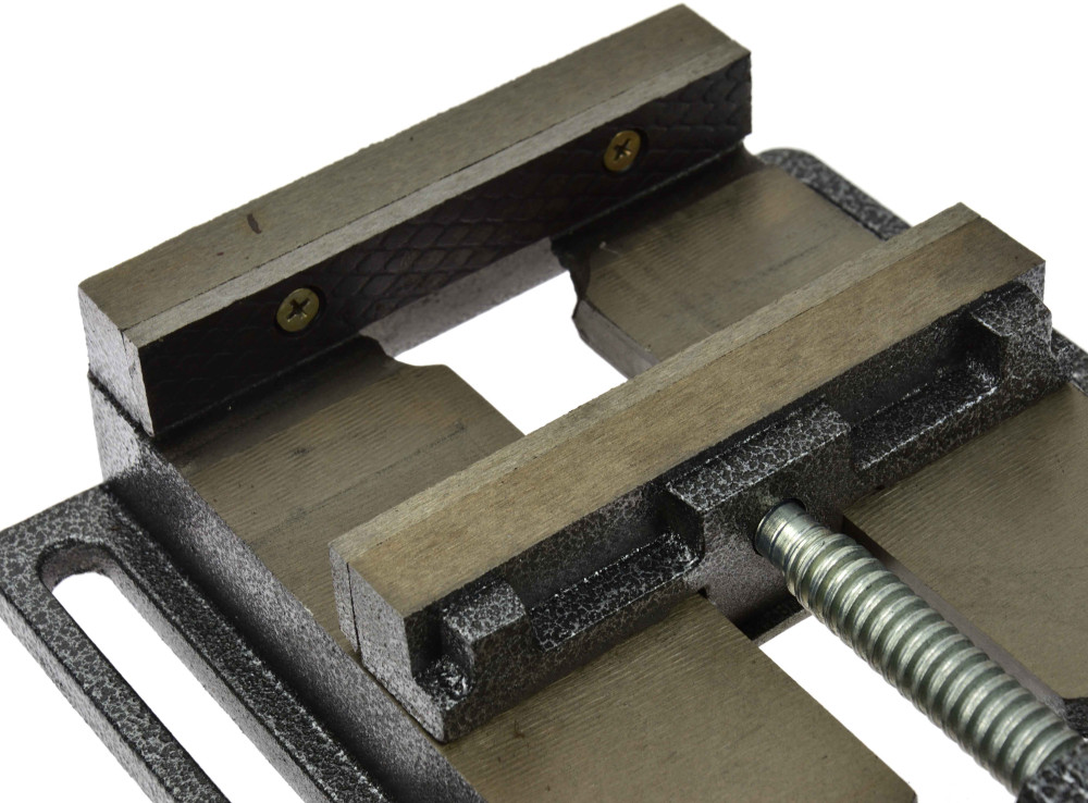 Strojný zverák s drážkovanou základňou pre jednoduchú montáž a umiestnenie zveráka. Vyrobené z liatej ocele s odolnými oceľovými čeľusťami s priečnymi drážkami pre lepšie uchopenie obrábaného predmetu.