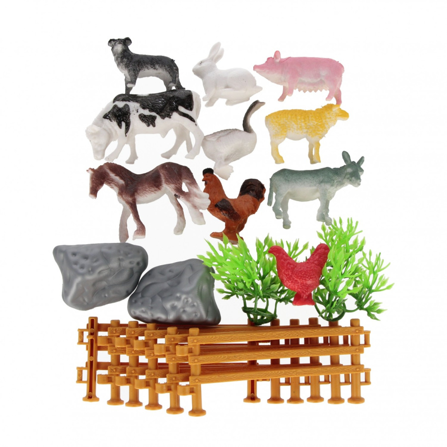 Zvieratká Farma s doplnkami je skvelá sada pre všetky deti, ktoré milujú hospodárske zvieratká! Umožňuje vytvoriť vlastný dvorček so zvieratkami a zároveň sa učiť ich názvy a prostredie, v ktorom žijú. Deti môžu rozvíjať fantáziu, jemnú motoriku aj kreativitu pri hraní s figúrkami a doplnkami. Súčasťou balenia je kôň, krava, osol, ovca, prasiatko, králik, pes, sliepka, hus, kohút, ohrada a 2 kamene. Figúrky sú vyrobené z mäkkého plastu. Odporúčané od 3 rokov. Cena za kus.